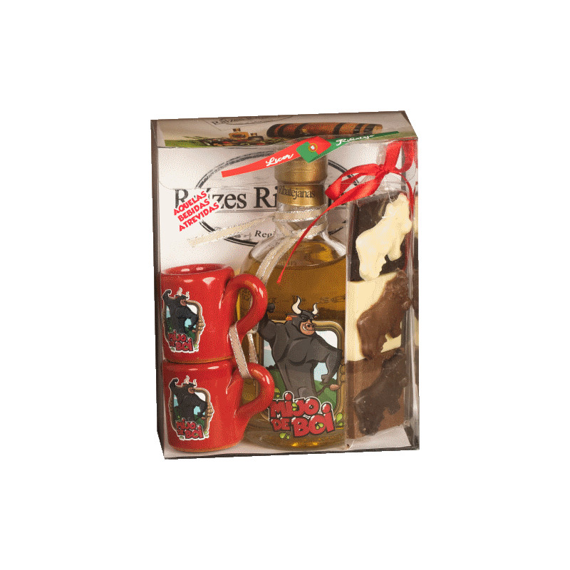 Caixa Licor Mijo de Boi 20cl 2 canecas cor 3 chocolates